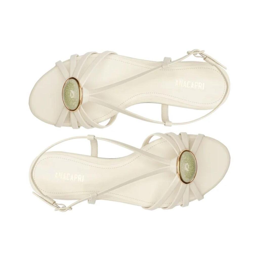 Sandália rasteira de multitiras e detalhe em pedraria, na cor branca. O modelo de biqueira arredondada, possui solado emborrachado, com leve saltinho traseiro. Apresenta cabedal com quatro tirinhas - arrematadas na parte central por maxi adorno redondo em pedraria colorida, com contorno metálico sobre os dedos - que seguem do peito do pé, presas pelas laterais. Traz fecho em fivela regulável em tira que contorna o calcanhar. Apresenta palmilha emborrachada confortável, no mesmo tom da rasteirinha, com assinatura Anacapri em carimbo metálico.